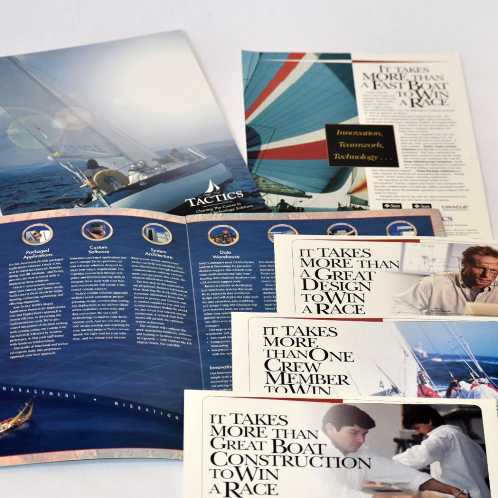 Tactics was an industry innovator with Oracle and believed, as with sailing, that preparation, planning, and a smart system design were the most crucial components of a winning solution.  Their corporate brochure, magazine advertising, and postcards were used to market their IT services across the nation.